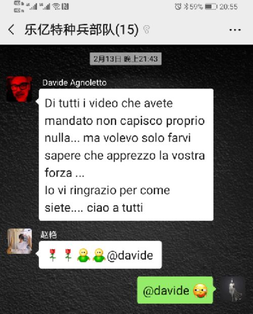 △杨梅的“乐亿特种兵部队”里卧虎藏龙,意大利优秀设计师DAVIDE AGNOLETTO先生担任乐亿尚家设计顾问,也是杨梅学习意大利语的“好帮手”。图为“乐亿特种兵部队”日常微信交流截图。