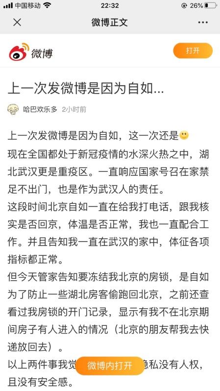 记者了解到,目前微博上已有多名疫情重点区域未返程租客,对自如为控制疫情而暂时冻结门锁表达不满。