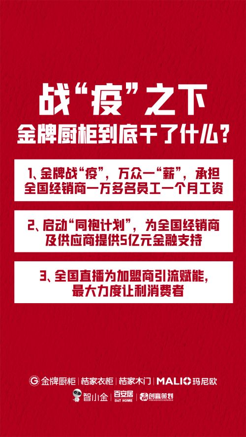 金牌战“疫”是对外支援,金牌厨柜一次性投入几千万向全国经销商的1万多名员工发放1个月工资,带动了“帮扶经销商、家居好工厂”的品牌爱心助力行动。