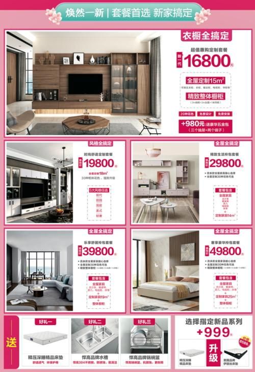 现代简约风格经典配搭,20种柜体花色随意挑。16800元全屋定制15m²,玄关柜、衣柜、餐边柜、电视柜、书柜皆可定制,还送整体橱柜3m地柜+3m台面+1m吊柜。除了16800“超值惠购定制套餐”,还有“时尚舒适拎包套餐”“精致生活拎包套餐”等多种宠爱套餐任你选,无论是小户型还是大户型,统统都能满足。