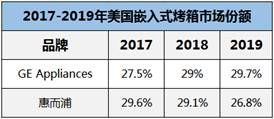 另外, 烤箱品类受益于智能技术应用,在美国厨电市场整体下滑的趋势下,保持2.2%的增幅。从2019年嵌入式烤箱细分市场来看,GE Appliances和惠而浦份额稳居前二,市场份额分别是29.7%和26.8%。