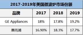 具体到产品,在美国用户日常使用频率较高的微波炉品类上,GE Appliances和惠而浦在2017-2019年占据着美国市场的前两名。2019年GE Appliances份额19.2%,惠而浦17.7%。