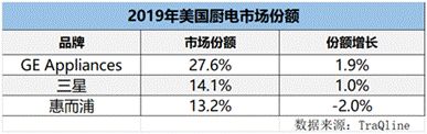从整体市场来看,受房地产行业和关税影响,2019年美国大型厨电市场整体销售下滑1%,仅GE Appliances与三星保持着份额增长。