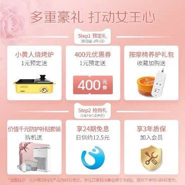 本次天猫女王节活动预定和抢购,均赠送多重豪礼!(如下图)截止至3月4日,一元预定即可获得小黄人烧烤炉、400元优惠券,收藏加购就送按摩椅养护礼包;3月5日0点起售,购机即赠价值千元的防护补贴套装(呼博士空气净化器、呼博士多功能消毒包、呼博士净化口罩),还可享24期免息,3年质保,全力做到售后让顾客满意放心!
