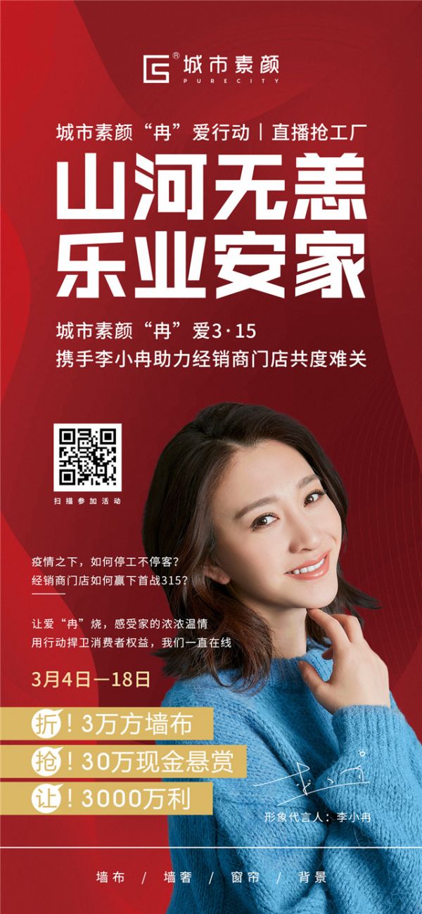 为减轻经销商负担,为推动企业复工开业,城市素颜先破题,后立意,策划“山河无恙 乐业安家”大型全国联动315活动。品牌形象大使李小冉爱心助力,用行动捍卫消费者权益,同心抗疫,“冉”爱行动,直播抢工厂。让爱“冉”烧,让家的浓浓温情在城市迅速蔓延升温。
