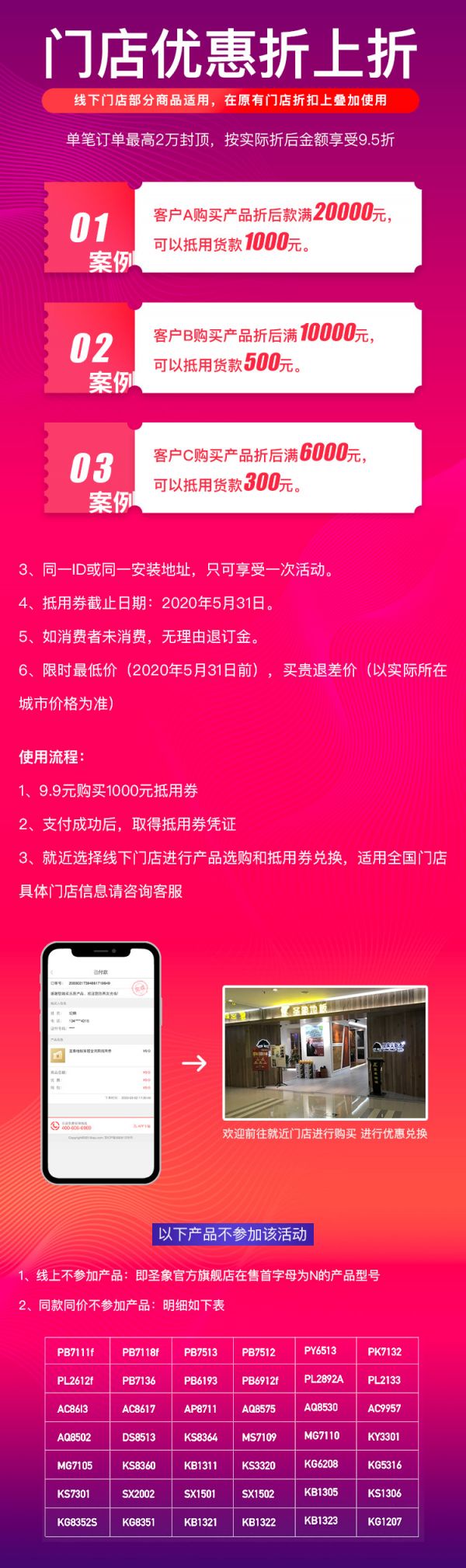 地板行业头部企业圣象地板积极部署和调整2020上半年营销策略,不惧挑战,以积极应战的姿态和颇具远见的洞察力迅速响应,与“家居全民购”平台一起,为消费者带来了诸多专享福利,不仅有9.9元购1000元抵用券,更有门店优惠折上折,按实际折后金额享受9.5折,单笔订单最高2万封顶!优惠幅度大,真让利,大手笔。