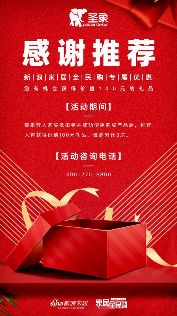 与此同时,圣象地板联合新浪家居还推出感谢礼专属优惠,推荐他人成功购买产品后,推荐人每笔订单可获得价值100元礼品,最高累计3次。惊喜福利送不停,更多优惠等你来解锁!