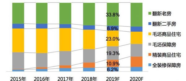 事实上,趋势早已显现。据奥维云网(AVC)数据评估推总,从住宅装修市场的产值结构来看,老房及二手房翻新市场在2019年合计占比超过40%,2020年将超过42%。而毛坯商品住宅市场的比重持续下降,2019年预计略低于23%,2020年可降至17.6%,毛坯房市场在2020年也将低于37%。由此,存量房翻新超过毛坯房市场产值规模的时代将继续深化。