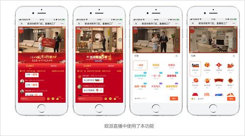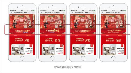 欧派直播活动中,盟主直播在直播界面下方添加了滚动广告,让用户对欧派主推的各种定制化家居产品及价格一目了然,并且用户通过广告点击可直接跳转至产品购买页面,大大提高了商品的购买率。