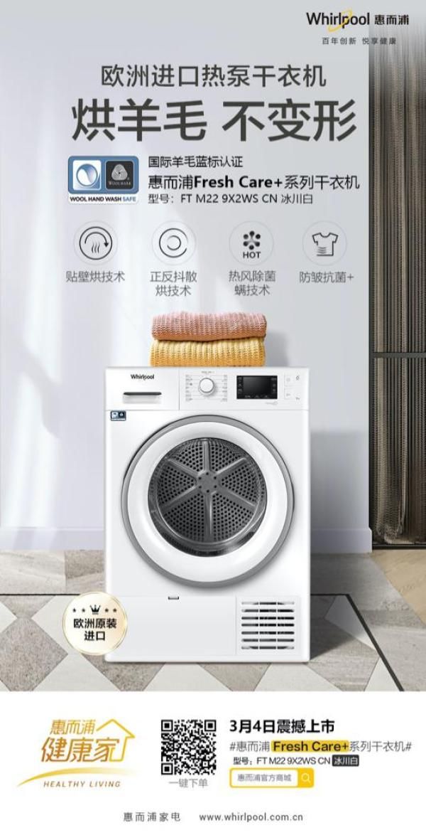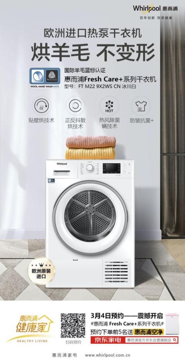 2020年3月4日,惠而浦Fresh Care+系列欧洲原装进口热泵干衣机正式上市。继续贯彻2020年“惠而浦健康家”理念,这款拥有国际羊毛蓝标认证、除菌除螨认证的干衣机,即便对于最“娇气”的高档羊毛织物,也能完美烘干安心无忧。Fresh Care+搭载第六感干衣控制系统,专业“烘干养护”一扫潮湿阴冷余寒,带来四季如春的清爽和熙与健康活力。