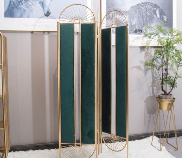 这款复古金属屏风不同于我们认知里的屏风,不是木框,不是白色的透明纱布,而是铁艺框架,和绿色的丝绒布料,有西方古典韵味,设计简约,风格独特。