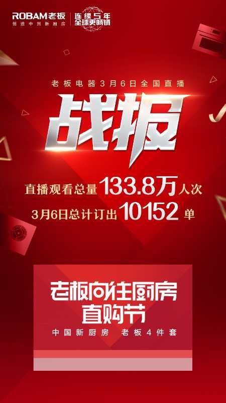 3月6日晚7:30,老板电器举办了一场主题为“向往厨房直购节”的直播活动。在这场持续两小时的限时秒杀狂欢趴中,老板电器打出一套漂亮的线上营销组合拳,展示了直播为品牌赋能带来的颠覆性影响。本次直播总共吸引超过133.8万人次在线观看,最终强势收官!