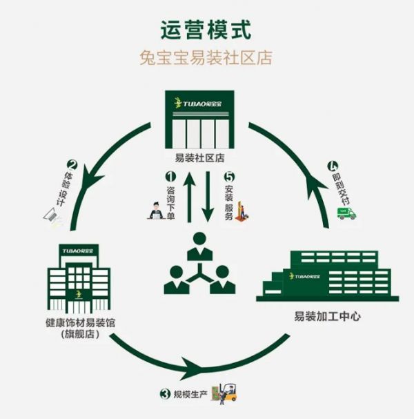兔宝宝易装以社区店为中心,以“4免标准服务+易管家服务+焕新家服务”打造易装终端服务体系;从获客和服务入手,完成从蓄客引流、设计体验、生产安装到售后服务的完整闭环。
