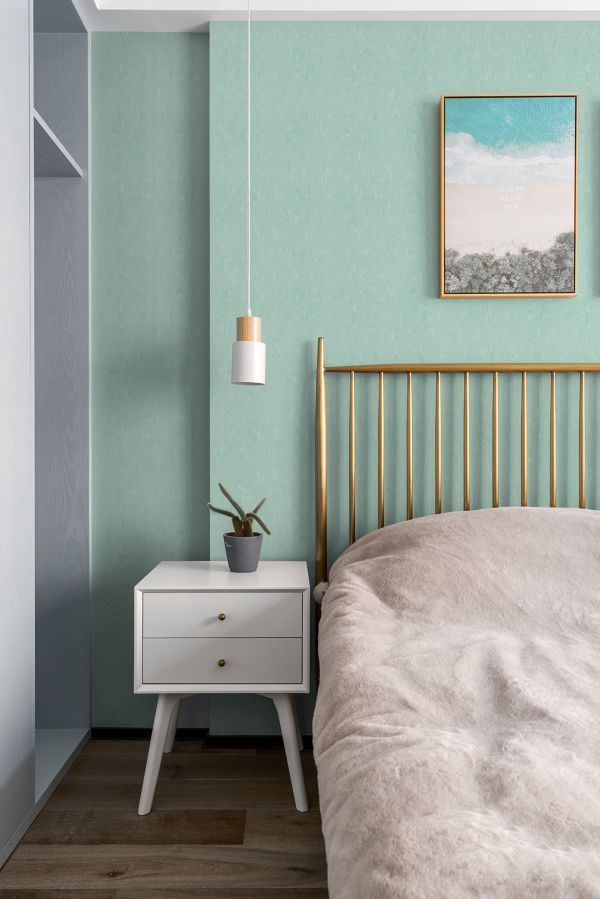 三角纹理相互交织,上墙后形成双层光影效果;斑驳的纹理堆积,呈现出耐人寻味的空间韵律。清新的浅松石色墙布搭配金属元素护墙板,简洁却不失精致。