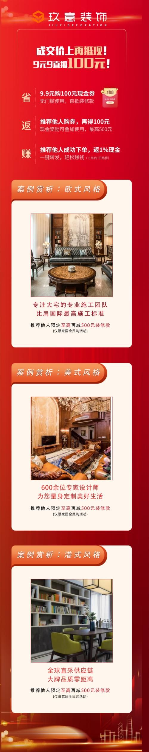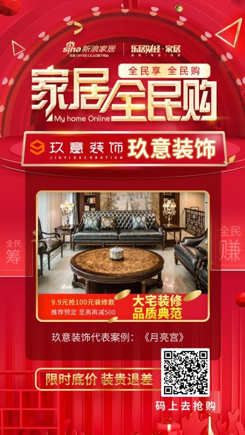 拥有众多高端设计师和优质主辅材资源的玖意装饰因势而谋,迅速入局,选择与大平台联手,登陆家居全民购平台,为消费者奉上一道精品家装的饕餮大餐:9.9抵扣100元装修款,5月31日前装贵退差价,推荐他人预定本人装修再减最多500元,推荐他人成单后,本人享受他人装修款1%现金返佣……足不出户,轻松搞定家装。
