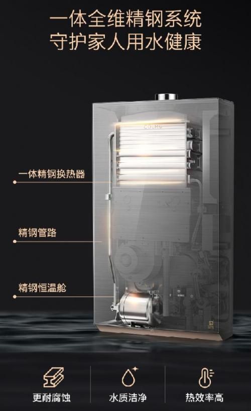 而作为热水器"心脏"的换热器,在精钢材质加持下,同样堪称完美。专利椭圆换热结构,使导热换热效率提升至90%,把每一丝热量都锁在热水器中,达到极致效能;导流结构的设计,则有效增强水流扰动,防止水垢在换热器这个"心脏"沉积。配合末端出水的精钢管路,保证水中绝不掺杂一丝水垢、铁锈,时刻保证用户的用水健康。