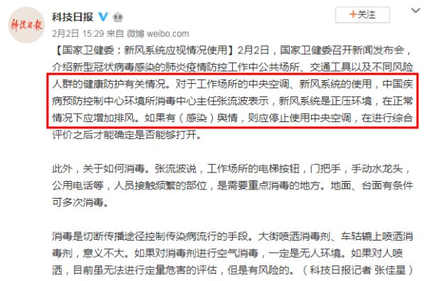 中国疾病预防控制中心环境所消毒中心主任张流波明确提出:"我们可以通过增加新风量来减少室内空气的无序外溢,因为室内是一个正压的环境,空气往走道里面跑,往其他地方跑,我们需要加一些排风来保证室内空气的有序排风。"