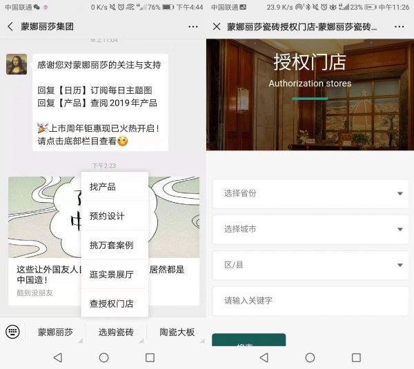 调查人员点开蒙娜丽莎的公众号,点击“查授权门店”菜单,页面自动跳转到授权门店地址表格页面,其中的下拉菜单栏还可以直接选择省份城市,显示出不同门店地址。而且,蒙娜丽莎的微信公众号的菜单栏设计讲究,包含了品牌介绍、选购指引、产品知识分享三大部分,充分考虑到加盟商及消费者的不同需求。