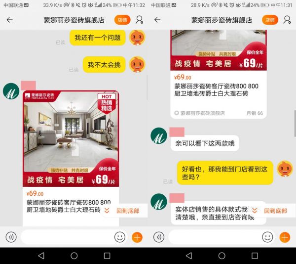 (天猫蒙娜丽莎瓷砖旗舰店咨询情况)