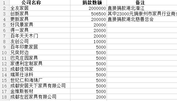 在武汉新型冠状病毒感染肺炎爆发以来,防疫物质严重短缺,全国各地高度重视,具有责任心的企业和组织纷纷投入到抗“疫”的战斗中,为新型冠状病毒感染肺炎疫情防控工作,做出自己的一份努力。四川省崇州市家具的龙头企业全友家居,在疫情防控的初期,便向湖北潜江捐助疫情防控善款2000000元整,崇州市家具行业商会会长兼创新家具总经理周云女士到国外寻找防疫物资,共计捐款捐物506500元整。更新家具也向湖北慈善总会转去疫情防控善款200000元整。崇州市家具行业商会在会长周云女士,秘书长魏榕城先生以及执行秘书长杨军的积极组织下,迅速募集善款,购买防疫物质并捐款。以下为会员单位的爱心捐款(单位/元)。