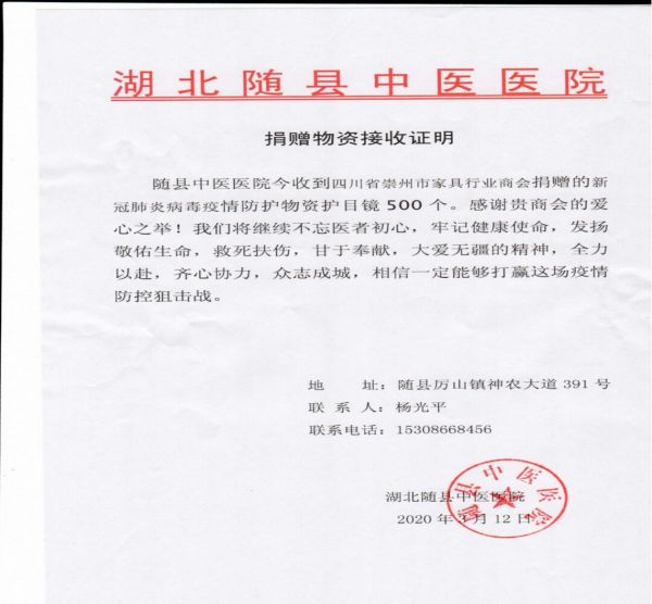 崇州市家具行业商会共募集善款140000元,其中物资采购医用护目镜2000个,每个35元,共计70000元整。其中500拨付湖北随县中医医院使用。余下的1500个医用护目镜由湖北省红十字会发放。