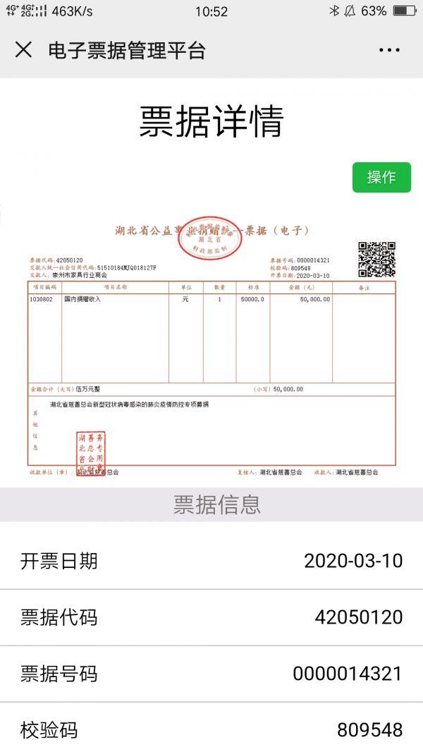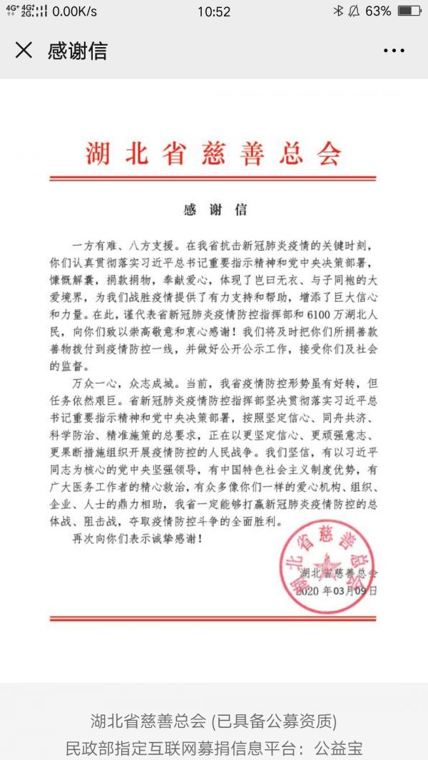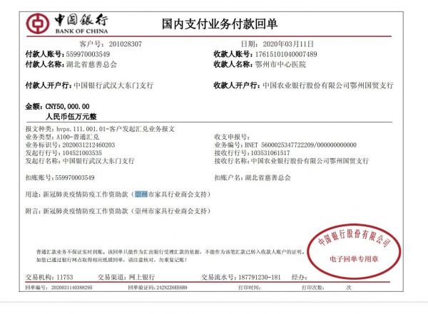 余下的善款50000元整于2020年3月9日,转入湖北慈善总会的对公账户,并于3月11日拨付鄂州市中心医院。