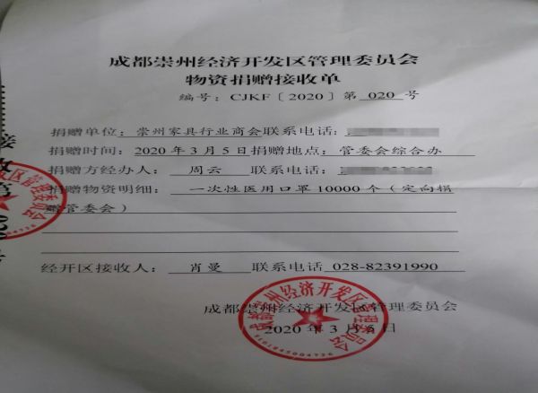 在疫情防控的关键时期,疫情防控与复工复产同步推进,崇州市已经迎来了复工潮。为助力成都智能应用产业功能区企业有序复工,崇州市家具行业商会向成都崇州市经济开发区管理委员会送去了10000个口罩,每个2元,共计20000元整。希望与成都智能应用产业功能区各企业携手并进,攻坚克难。