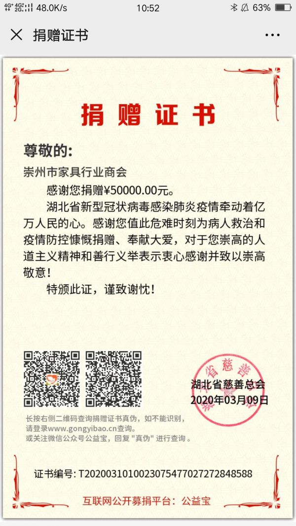 在此,感谢各公司的爱心善举,并向奋战在抗议前线的医务工作者和相关的工作人员致以崇高的敬意。崇州市家具行业商会坚信,我们万众一心,必将打赢这场没有硝烟的战争。武汉加油!湖北加油!中国加油!