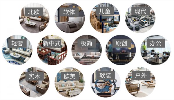 首届云家具展分现代、新中式、实木、极简、北欧、轻奢、软体、欧美、儿童、原创设计、软装饰品、户外生活、办公家具13大主题,能满足大部分家具经销商选品的需求。