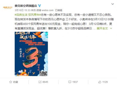 在话题发酵的过程中,奥克斯空调还联动苏宁易购平台和多位微博意见领袖共同助势,吸引了大量用户参与许愿活动,助力话题实现了滚雪球式自发传播。