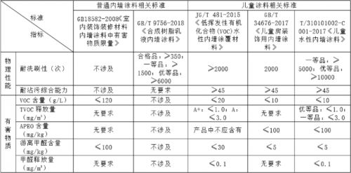 根据2017年推出的儿童涂料国家标准,对部分有害物质指标要求远高于普通内墙涂料,并且首次引入了烷基酚聚氧乙烯醚(以下简称:APEO)含量等环保指标。