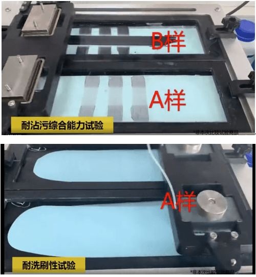 处在成长发育阶段的儿童天性活泼,很容易在家中玩闹过程中弄脏墙面。而具有良好物理性能的涂料不但让污渍容易打理,还可以延长涂层的使用寿命。因此,本次测试还主要围绕耐洗刷性和耐沾污性两个维度进行考核:耐洗刷性主要考量涂料承受日常擦洗的次数;耐沾污综合能力主要模拟墙体涂料沾染了日常的6种污渍后是否容易清洁,考量其耐脏性。