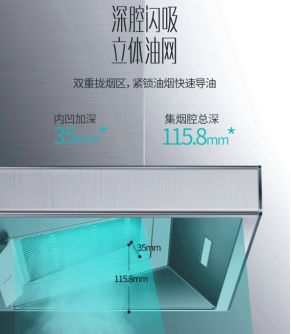 华帝天镜MAX油烟机i11124针对拢烟区作了创新性的设计,首先是将集烟腔的深度再升级,达115.8毫米;再与内凹立体油网精妙配合,拢烟效果强力提升的同时,形成真正的双重拢烟区。紧锁油烟快速导油,增加用户的操作空间,使用深锅亦能轻松烹饪。