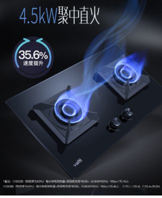 华帝大火力燃气灶i10052B拥有4.5kW的聚中直火,性能上通过优化口径喷嘴、铜合金内火盖的创新设计,以及由均分凹槽火盖、加宽进风口、混合氧气引射管这三大核心组成的立体进风技术,能充分燃烧不费气。火力均匀环喷,使锅底全面受热,且火力更稳定,热效率高达63%,对比于普通燃气灶,华帝这款产品的加热速度更是提升了35.6%。