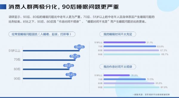 与年轻人不同,中老年在睡眠消费中更注重产品的健康属性。例如,70后的中年人更在意寝具的抑菌问题,具有防螨抗菌功能的抑菌床垫最受他们青睐。