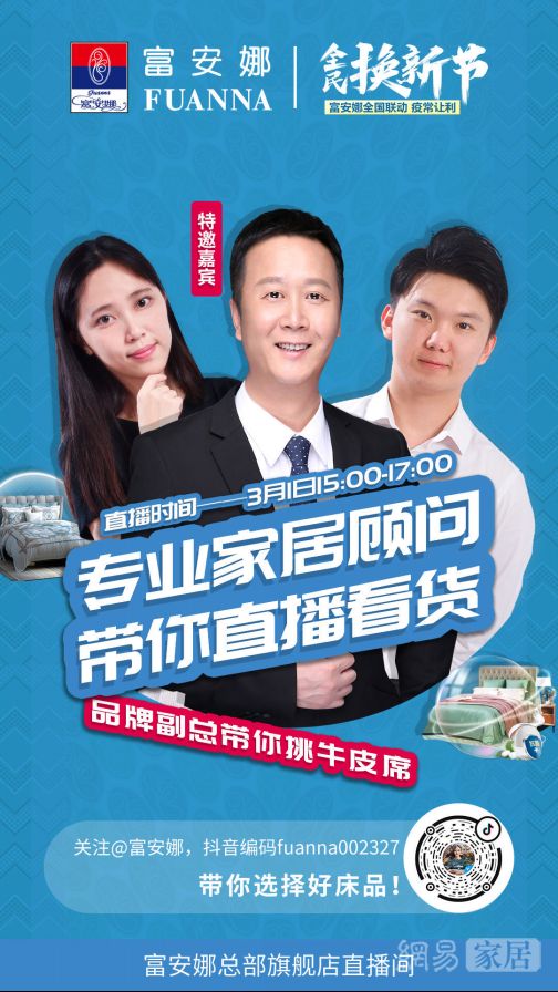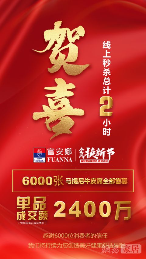 疫情爆发期间,富安娜全国统一联动,抗“疫”增收大型社群活动,3月1日,由品牌副总亲自直播带货,上线直播开放购买30分钟,2500张牛皮席售罄,单品成交额达1000万。2月29日—3月4日全民换新活动开展5天,实现总成交额6000多万,其中牛皮席单品销售额达到2400万。截止3月6日,实现总营收近1.8亿,其中33家子公司实现同期业绩逆增长,大部分加盟商实现增长,最高单店增长大150%。