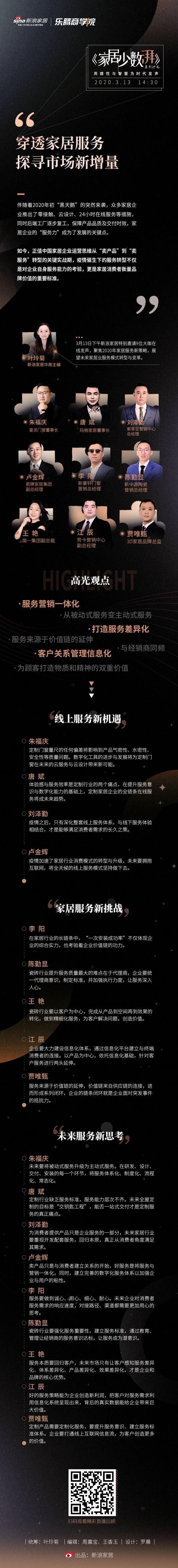 3月13日,新浪家居《家居少数湃》栏目特别策划“穿透家居服务,探寻市场新增量”线上沙龙。新浪家居华南主编叶玲菊独家连线皇派门窗董事长朱福庆,玛格家居董事长唐斌,索菲亚营销中心总经理刘泽勤,箭牌家居集团副总经理卢金辉,新豪轩门窗营销总经理李阳,新中源陶瓷营销总经理陈勤显,简一集团副总裁王艳,劳卡营销中心副总经理江辰,3D家居品牌总监贾唯甄9位嘉宾,线上聚焦各家居品牌在2020年的服务新策略,展望未来家居业服务模式的转型与变革。
