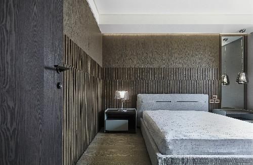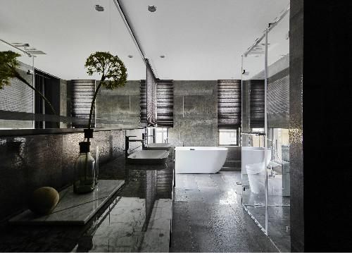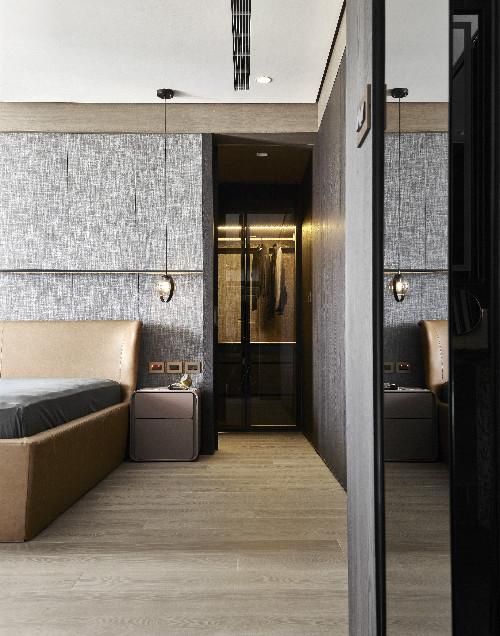 材料的拼贴分割展现质蕴的延伸与通透,卧室白色大理石的黑白纹路,木格栅在灰色系的空间,利用别具风格的吊灯,衬托出独树一格的格调。