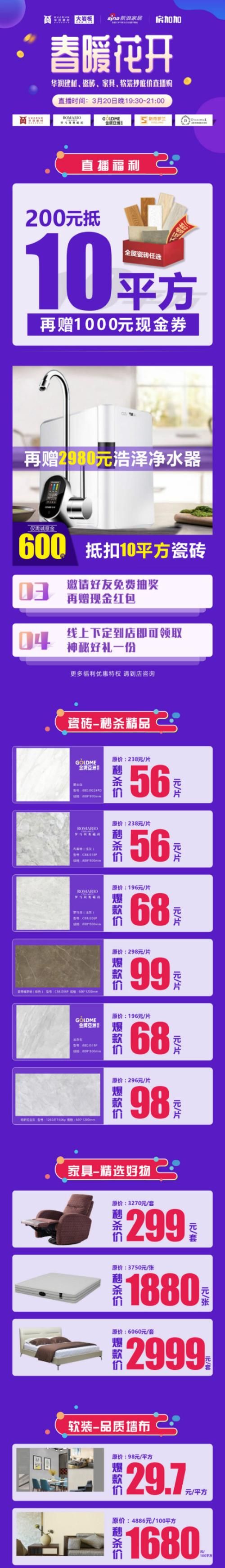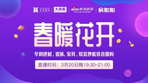 3月20日,华润建材春暖花开瓷砖、家具、软装抄底价直播购将在晚间19:30-21:00进行。多重福利,尽享美好家居生活。