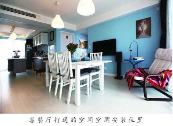 客厅和餐厅的室内机点位,90%以上,会选择在客厅和餐厅的分界线位置,客厅空调室内机朝南,餐厅室内机朝北,行业俗称“背靠背”。这么选择的原因是,一般的房屋在客厅和餐厅的分界位置,都会有1~2条横梁,这个本身就需要吊顶,正好可以利用这个吊顶结构,放置2台室内机。而且这个吊顶区域基本上正对着进户门,玄关位置,局部的吊顶也不会对人产生压抑感,可以在这片区域做出一些造型,增加进户时第一视觉的美感。