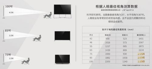 买电视之前,首先要确定电视尺寸,过大过小都不合适。经过测量,我家客厅沙发到电视柜之间的距离是3.5m左右。根据人眼和电视的距离对照表显示,3.5m左右的观影距离,电视尺寸选择80吋-85吋最为合适。