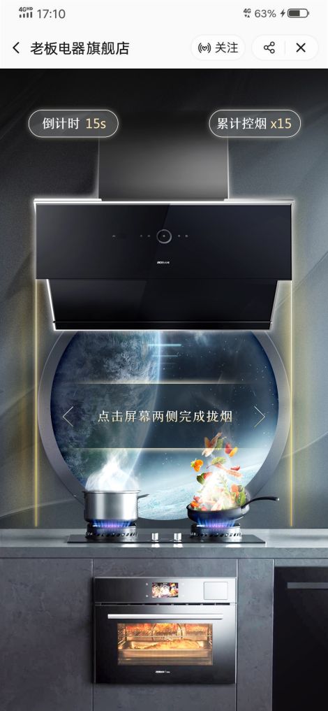 为了让消费者更好地体验三面灵拢大吸力油烟机5915S,老板电器在天猫旗舰店店铺二楼,推出了“三面灵拢 挑战极致拢烟”游戏,用户可以进入互动页面进行挑战。