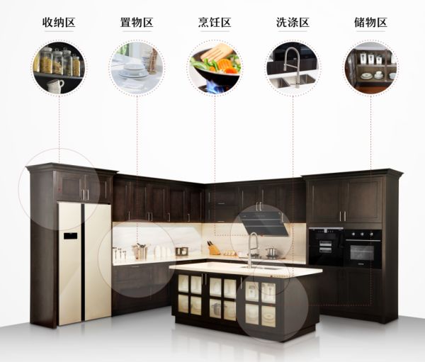 领尚橱柜从取食材到清洗、切剁、烹炒、装盘进行厨房动线规划,结合中国家庭烹饪习惯进行橱柜空间布局设计,合理规划橱柜的洗涤区、操作区、烹饪区、储存区、备餐区五大功能分区,有效提高做饭效率。