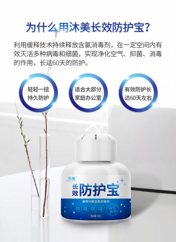 沐美防护宝,打破传统消毒液短板,抑菌方便消毒快捷,防护时间长达60天。利用的是缓慢释放技术,持续的释放含氯消毒剂,在一定的范围内净化空气、抑制细菌滋生、瞬间消毒。