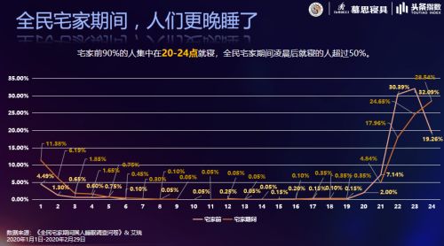 睡的时间比以前多了,但睡得更晚了。宅家时期好补眠,疫情期间国人睡眠时间超过8小时的人数增长了20%。卧室活动时长超过12小时的人较宅家前上升了19%,人们普遍卧室活动时间变长。宅家前,90%的人集中在20-24点就寝;宅家期间,凌晨后就寝的人超过50%。28%的人会睡到9-12点,失去早起动力的人增加了21%。换言之,在宅家期间国人养成了熬夜、晚睡晚起的不良睡眠习惯。