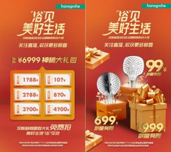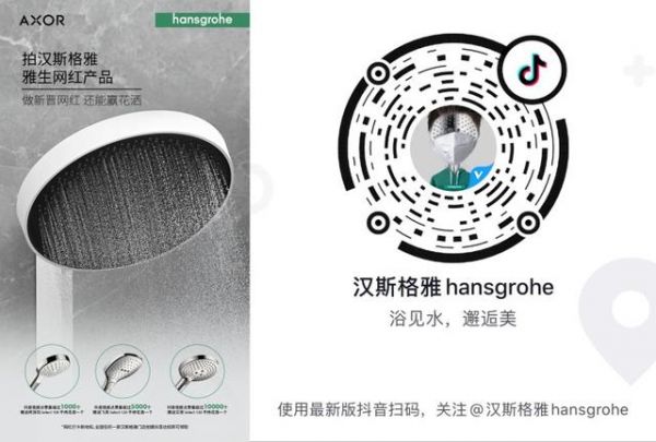 本次大促中,汉斯格雅首次联合全国近400家门店进行线上线下联动促销,从3月21日起的一个多月里,每个周六下午三点开始,全国各地30多个汉斯格雅官方授权区域城市账号都会同时开启各自的抖音直播,并与汉斯格雅hansgrohe官方抖音账号(搜索抖音号:hansgrohechina)即时互动。足不出户,直观感受汉斯格雅厨卫产品的设计、出水效果、套餐配搭、售后服务等干货信息。主播逗趣,内容好看之余——别忘记拼手速,在线抢优惠券。即可至所在城市线下门店兑换惊喜福袋和抽奖机会,有机会抢购仅需99元的汉斯格雅原装进口飞雨手持花洒;699元汉斯格雅PowderRain沄雨花洒;更有1,999元的神秘大礼包限量发售,可谓是上半年入手汉斯格雅的最佳时机。