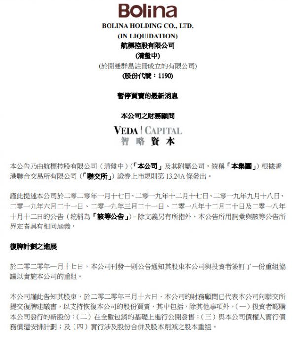 据了解,1月17日,航标控股已经与投资者签订了一份重组协议以实施公司的重组。公司将于适当时候刊发进一步公告,以使公众了解复牌申请的进展。该股份自2018年9月17日上午9时59分起暂停所有买卖。该股份将继续暂停买卖,直至达成联交所对公司提出的复牌指引以及任何补充和修订未止。