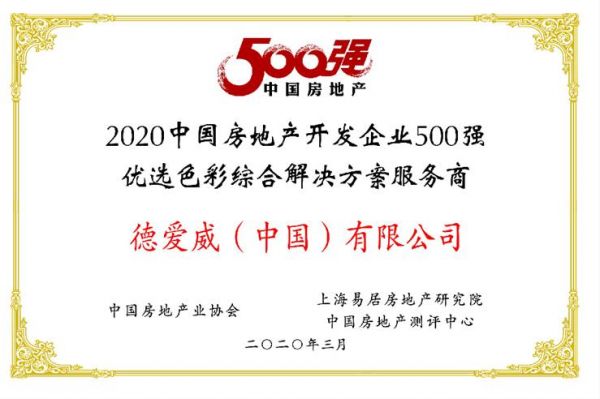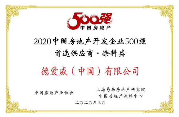 德爱威在进入中国市场短短3年时间里,连续获评“中国房地产500强首选供应商”。2020年,德爱威再次获得此项荣誉,且在涂料类主榜单的排名上升至第六位。