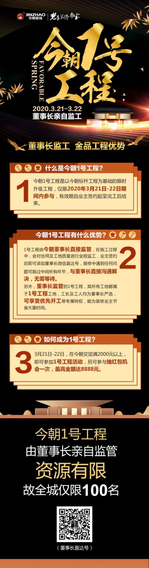 此外,今朝1号工程是以今朝标杆工程为基础的限时升级工程,仅限2020年3月21日-22日期间内参与,有效期自业主签约起至完工后结束!