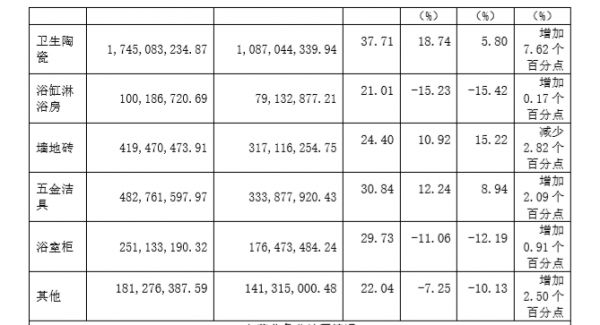惠达的产品主要包括卫生洁具、陶瓷砖和整体卫浴,其中卫生洁具包括卫生陶瓷、五金洁具、 浴缸、淋浴房和浴室柜,陶瓷砖包括内墙砖和地砖等,产品广泛应用于地产、酒店、公寓、学校、 医院等领域。从产品来看,惠达卫浴的浴缸淋浴房、浴室柜收入有所下滑,下滑幅度分别为15.23%、11.06%;卫生陶瓷、墙地砖和五金洁具的收入与上年同期相比有所增长。
